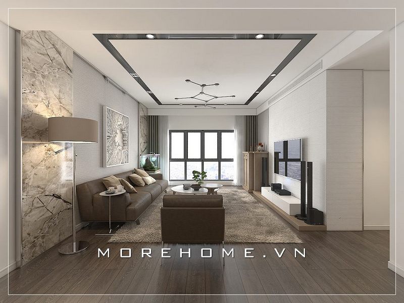 Sofa văng ba hiện đại với thiết kế đơn giản nhưng sang trọng cao cấp, chất liệu da màu nâu trầm lắng sẽ tạo nên một ấn tượng mạnh mẽ trong không gian phòng khách căn hộ chung cư.
