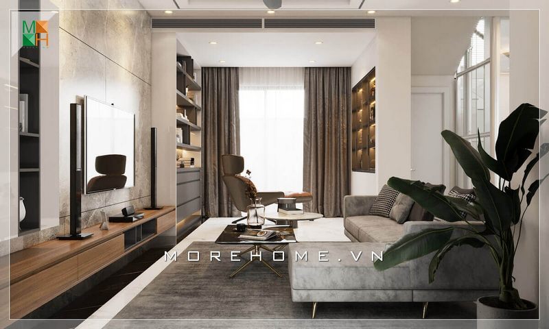Khung cửa rộng hướng sáng được đặt vào phòng khách chung cư hiện đại để tạo ra ánh sáng tự nhiên, giúp tạo độ gần gũi và thông thoáng trong không gian, hạn chế sử dụng nguồn sáng nhân tạo để tránh nhức mỏi mắt. Bộ sofa chữ L hiện đại cũng góp phần tạo nên sự sang trọng và ấm áp cho căn nhà.